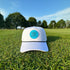 Elevate your golfing style with our Dad Golf white golf hat, featuring a striking teal blue logo that adds a touch of modern flair to your on-course look.